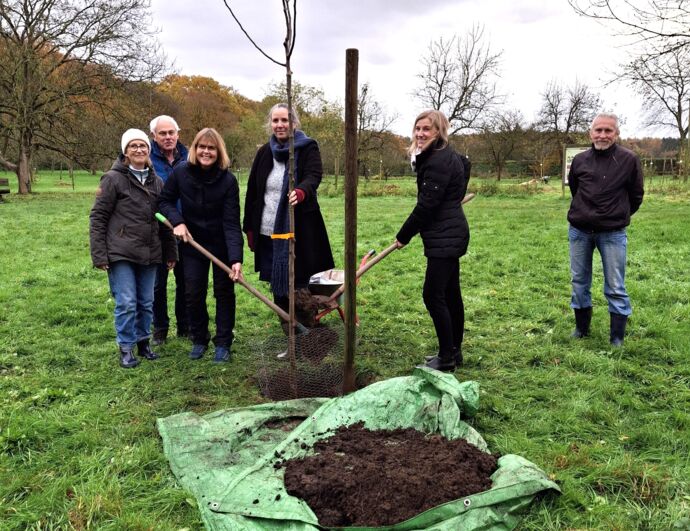 Im Rahmen dieser Kooperation pflanzte der Vorstand zusammen mit den Ehrenamtler-Team "Streuobstwiese" drei Apfelbäume robuster alter Sorten (Bäumchesapfel, Bergischer Herrenapfel, Moseleisenapfel.