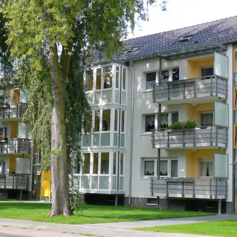neue wärmegedämmte Fassade, neue Balkone, z. T. Wintergärten und neue Haustüranlage