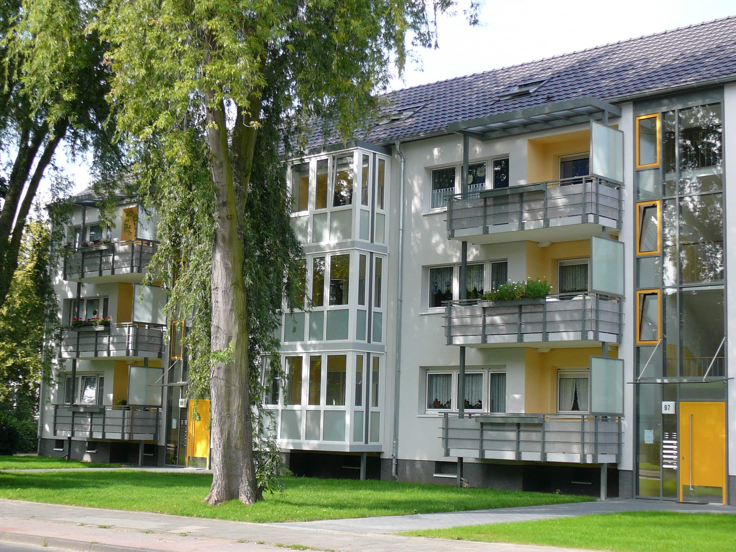neue wärmegedämmte Fassade, neue Balkone, z. T. Wintergärten und neue Haustüranlage